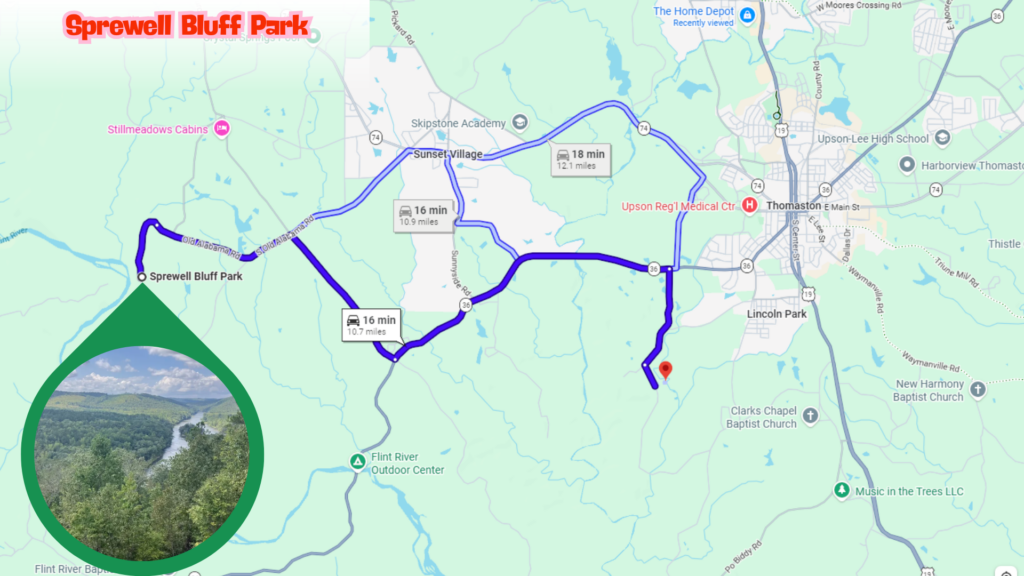 Sprewell Bluff Park, formerly Sprewell Bluff State Park, is a 1,372 acre Upson County, Georgia, park located between Roland and Crest. The park’s location on the Flint River makes it a popular place for swimming, fishing, kayaking, canoeing, and whitewater rafting. This gem on the Flint River is a perfect location for an overnight trip or a relaxing day in the park. Visitors can cool off in the gently flowing Flint River, skip rocks across the water, picnic along the river’s edge or go for a hike on the miles of trails along the river bank and up rocky bluffs offering excellent views from high above the river. Visitors can pick up park maps and more information on the park from the Trading Post and Information Center which is located at the entrance of the park.
