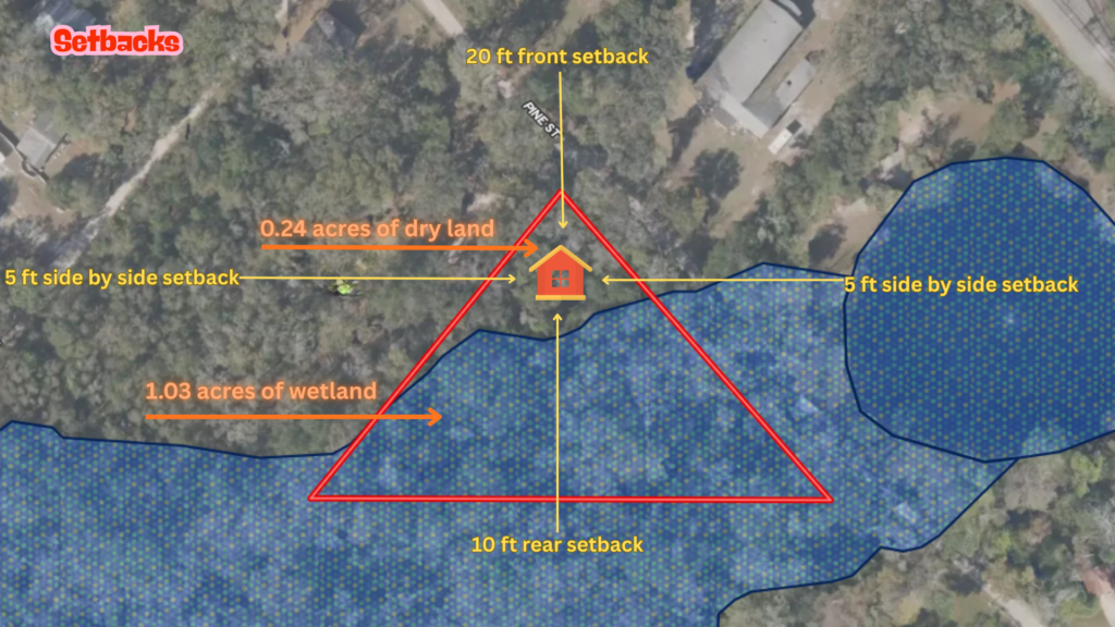 This parcel totals 2.27 acres, with approximately 1.03 acres designated as wetland, primarily located away from the main usable portion of the lot. That leaves about 1.24 acres of dry land, providing usable space for residential placement while still benefiting from the natural buffer and privacy that the wetland area creates.